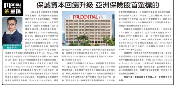 香港上市的保險股當中,投資者可以留意保誠(02378)。保誠2025年上半年業績彰顯執行力,傳統嵌入價值基礎的新業務利潤增長12%至12.60億美元,超出市場共識,主要由年度保費等值銷售額增長5%及利潤率擴張2個百分點至38%驅動。有效保險及資產管理業務產生的經營自由盈餘上漲14%至15.60億美元,標誌資本生成軌跡轉折點,反映近年優質承保及經驗差管控成效。經調整稅前經營溢利增長6%至16.44億美元,稅後則增7%至13.66億美元,每股基本盈利達49.3美分,較上年同期上漲12%。