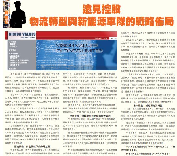 中長期而言,若能成功在新疆市場形成新能源物流的示範效應,公司不僅能提升盈利能力,更有望將模式複製至其他區域市場。配合中國在碳中和戰略下的政策扶持,遠見控股有機會成為區域性新能源物流的標杆。