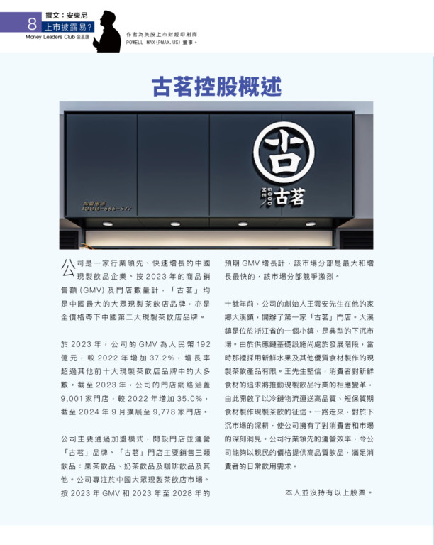 公司是一家行業領先、快速增長的中國現製飲品企業。按2023年的商品銷售額(GMV)及門店數量計,「古茗」均是中國最大的大眾現製茶飲店品牌,亦是全價格帶下中國第二大現製茶飲店品牌。