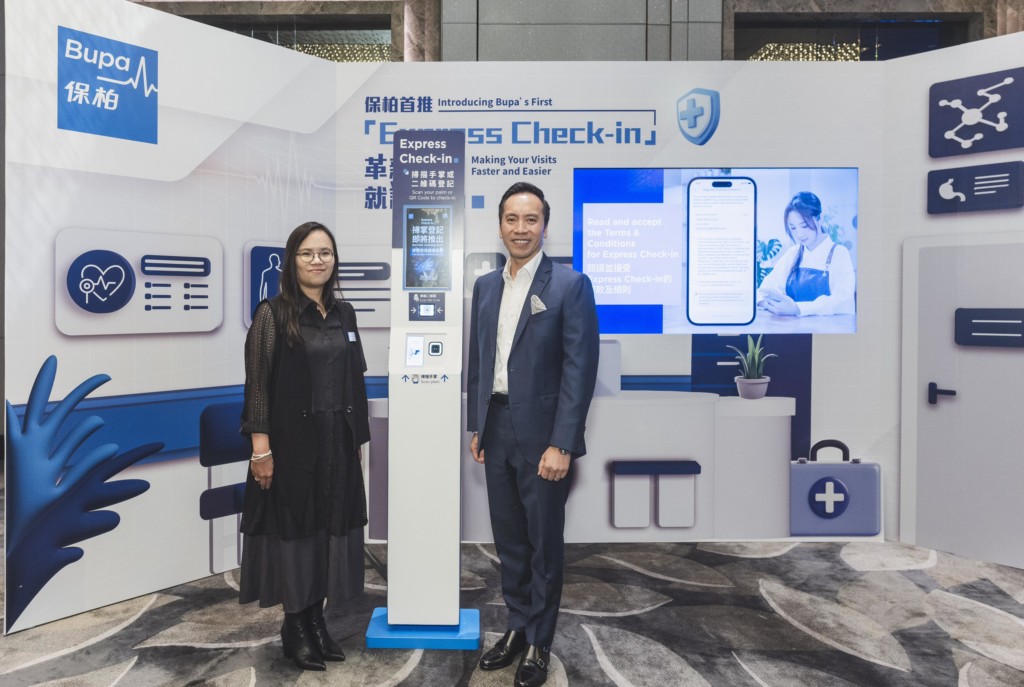 保柏香港保險業務總經理陳宇文 (右) 及 保柏香港首席客戶、數據及數碼官梁韻靈博士 (左) 宣佈保柏香港多項創新醫療體驗,包括即將啟用的「Express Check-in」就診登記系統,更引入全港首個應用於醫療場景的 「掃掌登記」技術,為市民提供高效、便捷、智能化就診體驗。