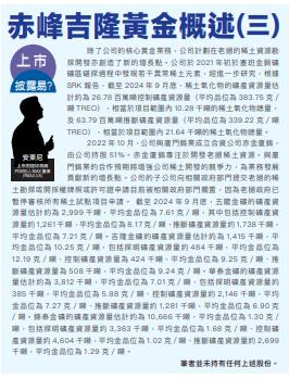 除了公司的核心黃金業務,公司計劃在老撾的稀土資源勘探開發亦創造了新的增長點。公司於2021年初於塞班金銅礦礦區碪探過程中發現若干異常稀土元素,經進一步研究,根據SRK報告,截至2024年9月底,稀土氧化物的礦產資源量估計約為26.78百萬噸控制礦產資源量(平均品位為383.75克╱噸TREO),相當於項目範圍內10.28千噸的稀土氧化物總量,及63.79百萬噸推斷礦產資源量(平均品位為339.22克╱噸TREO),相當於項目範圍內21.64千噸的稀土氧化物總量。