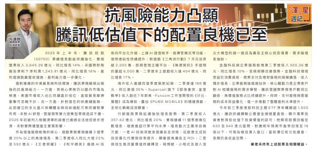 2025年上半年,騰訊控股(00700)業績增長動能持續強化,實現營業收入3,645.26億元,同比增長14%;非國際財務報告準則下淨利潤1,243.81億元,同比增長16%,盈利增速跑贏營收增速,盈利能力進一步優化。
