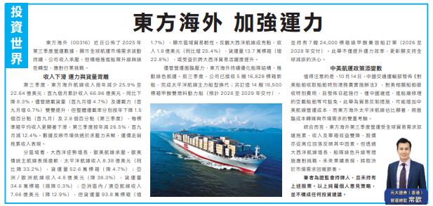 東方海外(00316)近日公佈了2025年第三季度營運數據,顯示全球航運市場需求波動持續,公司收入承壓,但積極推進船隊升級與綠色轉型,應對行業挑戰。