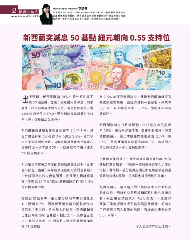 新西蘭聯儲在8月時預測,OCR將在年底前降至2.5%,理由是經濟停滯,需要刺激措施。但其後數據顯示,第二季度國內生產總值(GDP)下降0.9%,是新西蘭聯儲預期降幅的三倍,市場因此押注央行將進一步大幅放鬆政策。