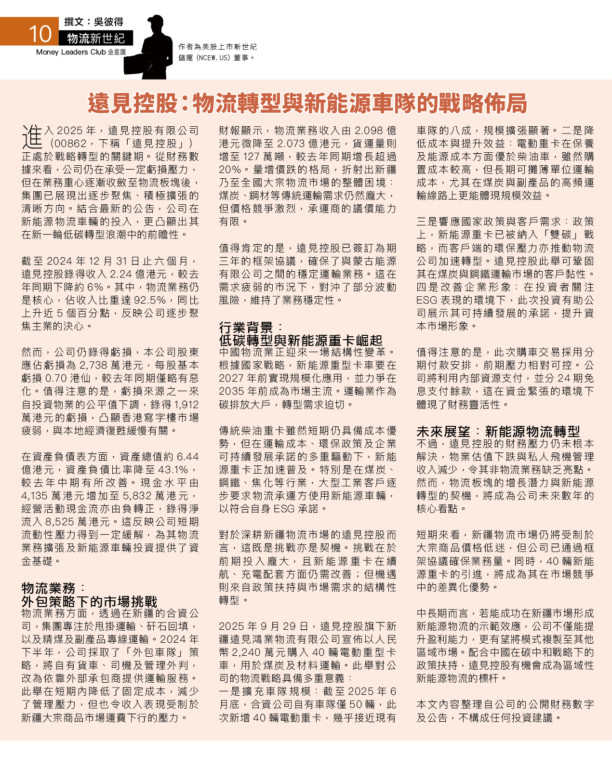 進入2025年,遠見控股有限公司(00862,下稱「遠見控股」)正處於戰略轉型的關鍵期。從財務數據來看,公司仍在承受一定虧損壓力,但在業務重心逐漸收斂至物流板塊後,集團已展現出逐步聚焦、積極擴張的清晰方向。結合最新的公告,公司在新能源物流車輛的投入,更凸顯出其在新一輪低碳轉型浪潮中的前瞻性。