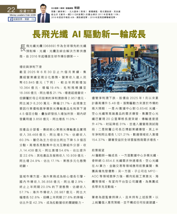儘管淨利潤下跌,股價自2025年1月以來累計最高爆升5.48倍。漲勢驅動力來源於市場的兩大預期:一是AI數據中心對G.654E光纖、空心光纖等高端產品的需求爆發,集團空心光纖已實現20公里單根長度突破,傳輸速度提升47%,时延降低31%,並進入運營商測試階段;二是附屬公司長芯博創業績爆發,其上半年淨利同比增長1,121.21%,數通領域收入激增154.37%,顯著受益於全球雲服務商需求增長。