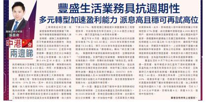 另一方面,豐盛生活旗下擁有中港多項保險經紀牌照的新域保險,正迅速成為豐盛生活的新成長動力。在2025財政年度,新域全面收購北京新域,並於蘇州設立分支機構,進一步加強在中國,尤其華東及大灣區的業務佈局。此外,新域透過入股中華煤氣附屬公司家域控股27%股權,成功接觸中港兩地逾4,000萬住宅用戶,提供綜合保險及風險管理方案,建立穩固的客戶資源。憑藉團隊的議價能力及廣泛服務網絡,新域成功投得總值3,200萬元的15份大型合約,續保客戶保留率逾九成,突顯其市場競爭力。上述新發展不僅擴大業務規模與市場滲透率,更為公司在保險、風險管理及大灣區業務拓展奠定穩固基礎,有助提升收入穩定性與品牌附加值,並為盈利結構多元化帶來長遠競爭優勢。