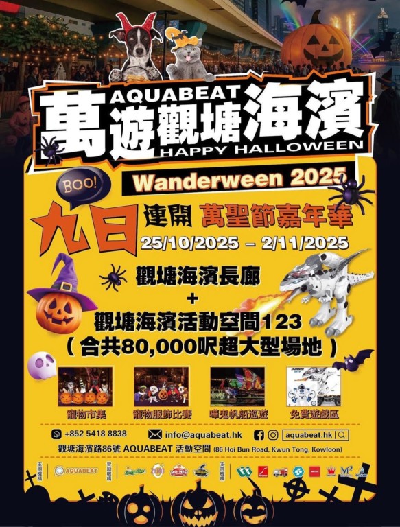 由AquaBeat主辦的「Wanderween萬遊觀塘海濱2025」將於10月25日至11月2日於觀塘海濱活動空間舉行。活動亮點包括收費主題遊樂與遊戲攤位,鬼馬萬聖充氣城堡彈跳床與各式搞鬼遊戲攤位,贏取南瓜造型玩具、糖果及鬼怪小掛件等獎品。