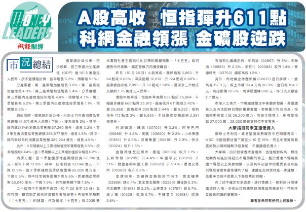 昨日(10月20日)A股高收。滬綜指報3,863,升24點或0.63%;深成指報12,813,升124點或0.98%;創業板指收報2,993,升58點或1.98%。滬深京三市總成交額約1.75萬億元人民幣。