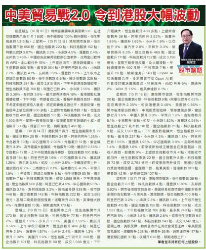 前星期五(10月10日)特朗普展開中美貿易戰2.0,在社交媒體表示由11月1日起,向中國徵收100%額外關稅。恒生期指急挫1,313點。上星期一(10月13日)港股開市急挫。恒生指數開市跌656點,國企指數跌223點,科技指數跌152點。阿里巴巴跌3.87%,騰訊跌3.3%,小米跌4.5%,滙豐跌2.4%,友邦跌3.45%。中國政府放棄用微軟辦公室軟件,改用金山軟件的WPS。金山軟件升15%。上午接近收市,港股跌幅擴大,恒生指數跌900多點,最多跌954點。阿里巴巴跌5.4%,小米跌7.7%,騰訊跌4.1%,友邦跌3.9%,滙豐跌2.2%。上午收市上證綜合指數跌50點。恒生指數跌916點,國企指數跌325點,科技指數跌284點。成交2,815億元。下午早段港股跌幅收窄,恒生指數跌不足700點。阿里巴巴跌4%,小米跌7.55%,騰訊跌3.38%,友邦跌3.6%。耀才證券逆市升18%,香港證監批准螞蟻收購。下午中段,特朗普改口風,聲稱中美關係良好,美國不希望中國經濟陷入衰退,將在南韓會見習近平。港股反彈,恒指從早上低位反彈500多點。上證綜合指數收市跌7點,恒生指數收市跌400點,國企指數跌135點,科技指數跌114點,成交4,903億元。星期一晚美股反彈,收復前星期五跌幅的七成。道瓊斯升588點,標普升102點,納斯達克升490點。