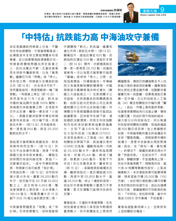 筆者認為,久違的中美貿易戰,在全球投資者全情投入享受股市熱鬧時重燃戰火,而中美關係在上周突然轉趨緊張,導致已持續強勢及予人抗跌能力高的港股受到衝擊。儘管港股對比其他主要金融市場,從點數來看確實仍有一段距離,但畢竟港股已累積一定升幅,尤以科技股及人工智能(AI)概念相關股份升幅可謂「驚人」。故此,市場上偶有風吹草動,投資者便會開始先行沽貨止賺,導致沽壓沉重。而由於現今恒指的組成,絕大部分以科技股為主,所以每逢科技股或相關股份調整,恒指跌幅超過500點已成定律。加上根據歷史紀錄,中美貿易戰所產生的後遺症令全球「聞風喪膽」,其對股票市場的殺傷力,更是令投資者出現恐慌情緒。因此,在「唔怕一萬,最怕萬一」的情況下,建議投資者在現水平要「持盈保泰」。在政治市下,保持盈利、靜觀其變,不宜過勇為上策。而在中美貿易戰下,預期高科技、晶片或AI相關等戰略性股份,上落波幅會較大。未來港股前景可能變得模糊,現希望能守穩25,000點(100天線)。由於現行港股應以穩守突擊及見好就收的投資方法,故此在選擇股份方面,建議選擇防守性較高的股份。「中特估」有抗跌特質,當中中海油(0883)攻守兼備,不妨留意。