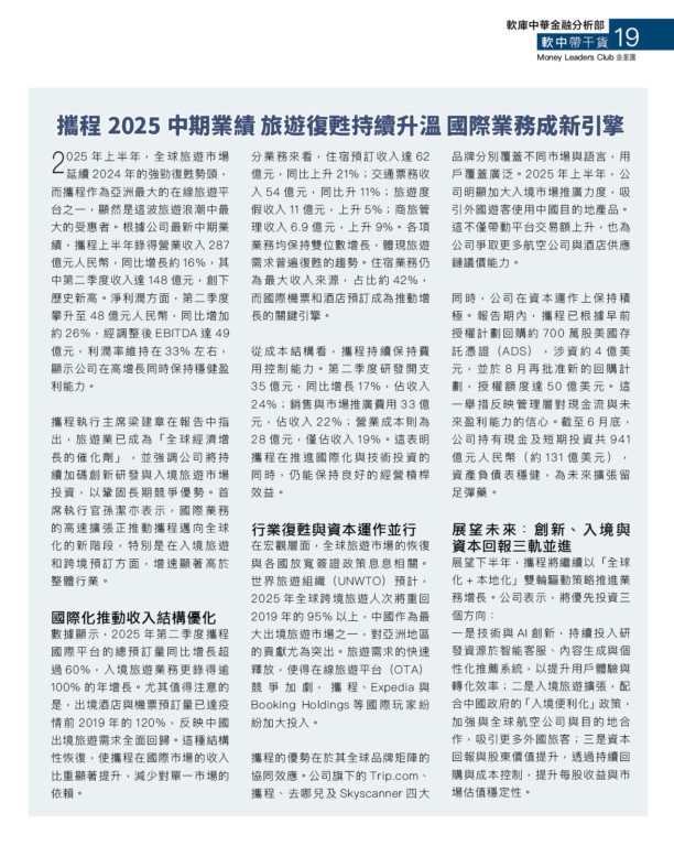 一是技術與AI創新,持續投入研發資源於智能客服、內容生成與個性化推薦系統,以提升用戶體驗與轉化效率;二是入境旅遊擴張,配合中國政府的「入境便利化」政策,加強與全球航空公司與目的地合作,吸引更多外國旅客;三是資本回報與股東價值提升,透過持續回購與成本控制,提升每股收益與市場估值穩定性。