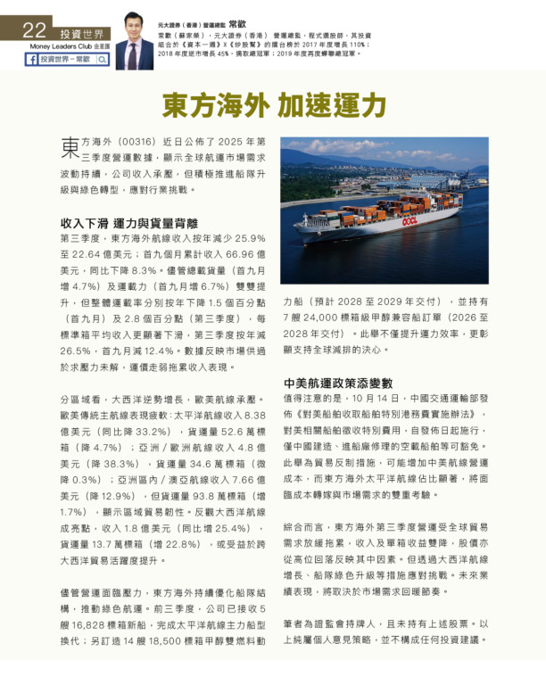 儘管營運面臨壓力,東方海外持續優化船隊結構,推動綠色航運。前三季度,公司已接收5艘16,828標箱新船,完成太平洋航線主力船型換代;另訂造14艘18,500標箱甲醇雙燃料動力船(預計2028至2029年交付),並持有7艘24,000標箱級甲醇兼容船訂單(2026至2028年交付)。此舉不僅提升運力效率,更彰顯支持全球減排的決心。