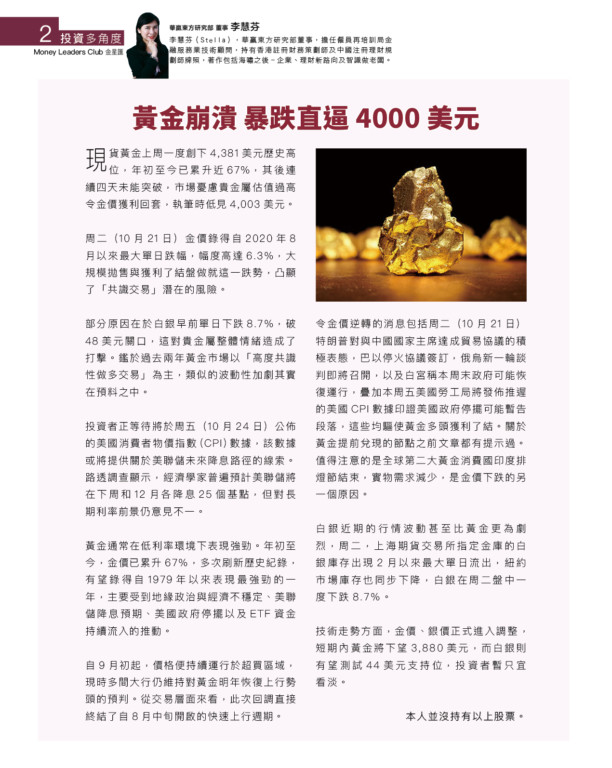現貨黃金上周一度創下4,381美元歷史高位,年初至今已累升近67%,其後連續四天未能突破,市場憂慮貴金屬估值過高令金價獲利回套,執筆時低見4,003美元。