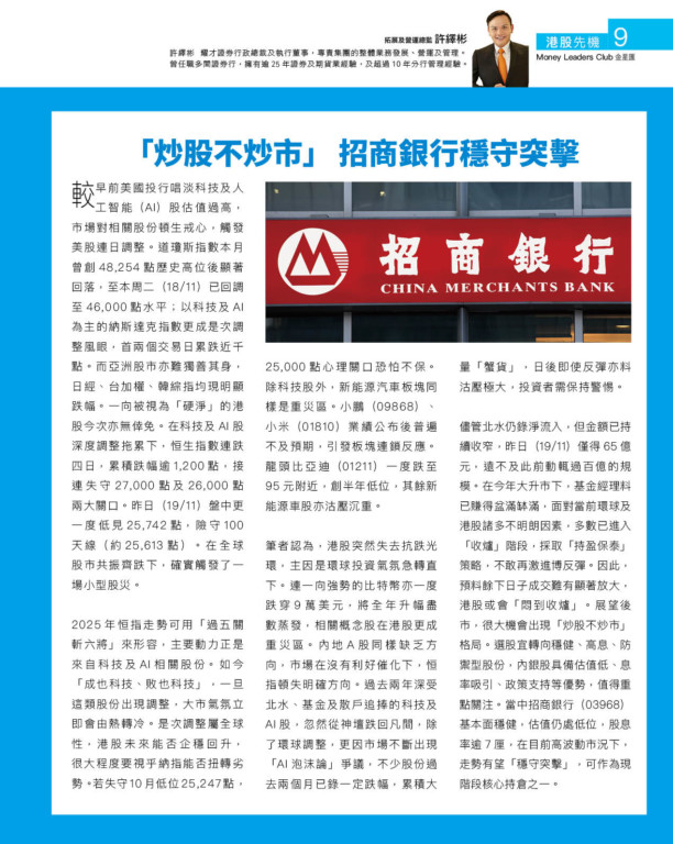 儘管北水仍錄淨流入,但金額已持續收窄,昨日(19/11)僅得65億元,遠不及此前動輒過百億的規模。在今年大升市下,基金經理料已賺得盆滿缽滿,面對當前環球及港股諸多不明朗因素,多數已進入「收爐」階段,採取「持盈保泰」策略,不敢再激進博反彈。因此,預料餘下日子成交難有顯著放大,港股或會「悶到收爐」。展望後市,很大機會出現「炒股不炒市」格局。選股宜轉向穩健、高息、防禦型股份,內銀股具備估值低、息率吸引、政策支持等優勢,值得重點關注。當中招商銀行(03968)基本面穩健,估值仍處低位,股息率逾7厘,在目前高波動市況下,走勢有望「穩守突擊」,可作為現階段核心持倉之一。