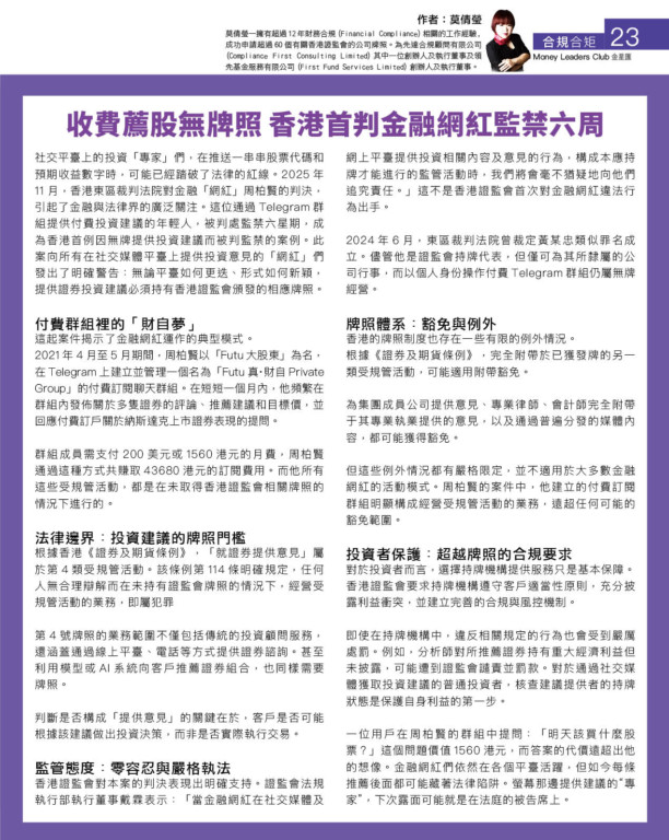 社交平臺上的投資“專家”們,在推送一串串股票代碼和預期收益數字時,可能已經踏破了法律的紅線。2025年11月,香港東區裁判法院對金融“網紅”周柏賢的判決,引起了金融與法律界的廣泛關注。這位通過Telegram群組提供付費投資建議的年輕人,被判處監禁六星期,成為香港首例因無牌提供投資建議而被判監禁的案例。此案向所有在社交媒體平臺上提供投資意見的“網紅”們發出了明確警告:無論平臺如何更迭、形式如何新穎,提供證券投資建議必須持有香港證監會頒發的相應牌照。