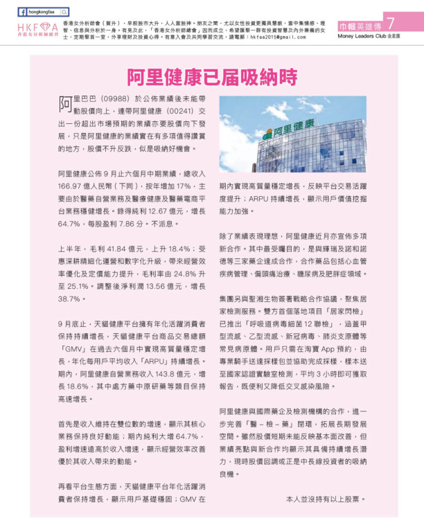 阿里巴巴(09988)於公佈業績後未能帶動股價向上,連帶阿里健康(00241)交出一份超出市場預期的業績亦要股價向下發展,只是阿里健康的業績實在有多項值得讚賞的地方,股價不升反跌,似是吸納好機會。
