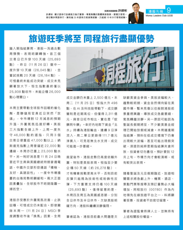 隨着聖誕及元旦假期臨近,旅遊相關需求將急劇上升,機票、酒店、景點門票等搜尋及預訂量勢必大幅增加,同程旅行(00780)作為內地領先在線旅遊平台之一,料將顯著受惠,投資者不妨密切留意。