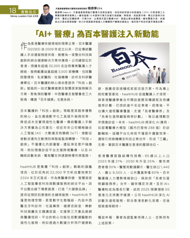 香港醫療面臨結構性挑戰,65歲以上人口2023年達21%,2030年升至25%,慢性病患者增30%。醫管局數據顯示,醫生缺口1,440人,護士9,500人,公共覆蓋率僅60%。百本醫護藉人力優勢填補缺口,與政府「長者社區照顧服務券」合作,確保穩定來源。至於AI+醫療則成為增長引擎,政府2025預算撥款50億港元支持數字健康。公司healtHUB深化AI診斷及遠程服務,契合香港老齡化浪潮,往後發展值得期待。