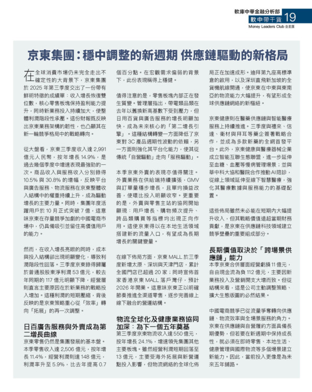在線下佈局方面,京東MALL於三季度新增太原、深圳與天津門店,累計全國門店已超過20家;同時宣佈首家香港京東MALL落戶灣仔,預計2026年開業。這意味京東正以明確節奏推進全渠道零售,逐步完善線上線下融合的營運結構。