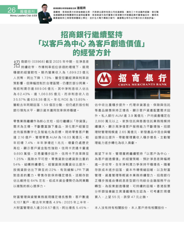 香港股票分析師協會副主席潘鐵珊先生指出,招商銀行(03968)截至2025年中期,在淨息差持續收窄、市場利率低位徘徊的環境下,展現穩健的經營韌性。期內營業收入為1,699.23億元人民幣,同比下降1.73%,雖受宏觀經濟與利率政策影響,但降幅控制於合理區間,仍優於部分同業。稅前利潤亦達889.06億元,其中淨利息收入佔比為62.43%,達1,060.85億元,而非利息收入佔35.57%達638.38億元。年化ROE為13.85%,雖較去年同期回落1.59個百分點,但仍處於股份制銀行領先水平,顯示資本運用效率保持穩健。