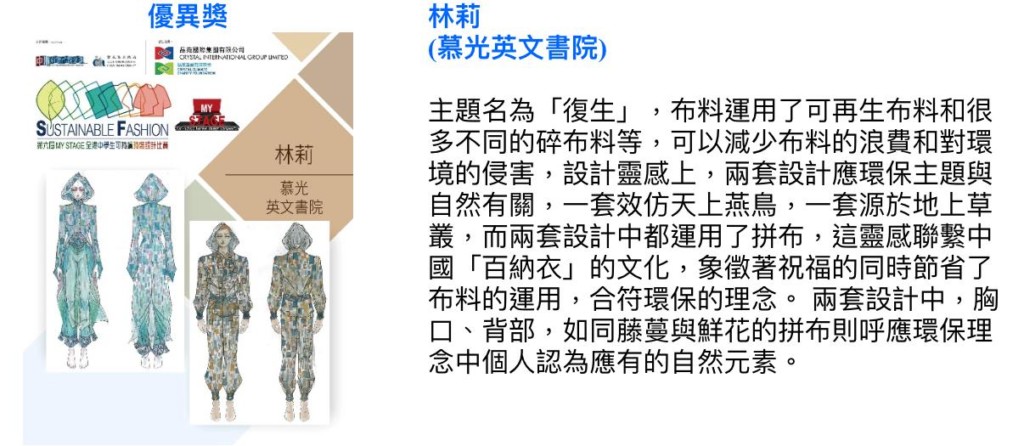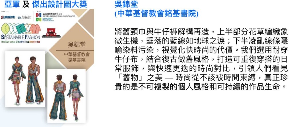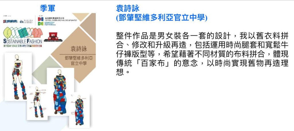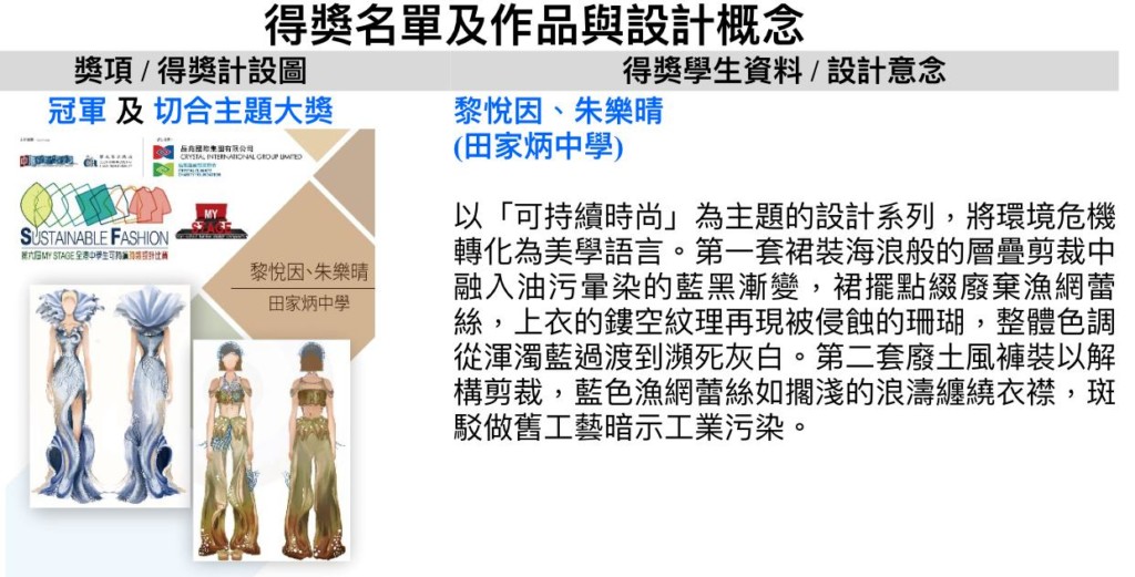 由「中港新世代協進會」及「製衣業訓練局」合辦、獲「晶苑國際(2232)「晶苑氣候慈善基金」資助的「第六屆 MY STAGE 全港中學生可持續時裝設計比賽」,12月20日(星期六)假第59屆工展會舞台隆重舉行時裝Catwalk Show 及頒獎典禮,活動在政制及內地事務局副局長胡健民見證下圓滿結束。