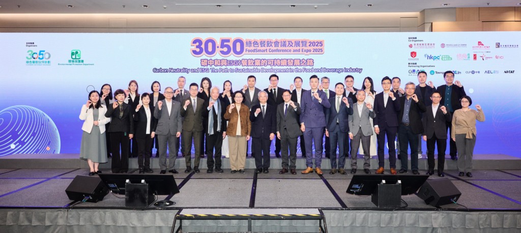 由環境保護署(環保署)與「30 • 50綠色餐飲伙伴計劃」合辦的年度業界盛事 —「30 • 50 綠色餐飲會議及展覽 2025」及「碳中和「減廢)約章及惜食約章 暨 『咪嘥嘢食店』計劃表揚儀式」今日2025年12月19日於香港會議展覽中心圓滿舉行。活動以「碳中和與ESG:餐飲業的可持續發展之路」為主題,匯聚政商界領袖及行業專家,深入探討環境、社會及管治(ESG)理念與碳中和目標的深度融合。面對全球綠色經濟轉型,大會為業界提供了創新廚餘管理、碳中和及ESG解決方案,並分享可持續營運的實戰經驗,協助餐飲業界優化廚餘管理及提升營運效率,將減碳挑戰轉化為可持續發展的商業機遇。