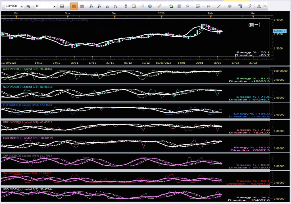 - GBP英鎊:[強弱指數@46/100;趨勢/力度@向下/-76,242;剩餘能量@28.8%] 強弱指數在中等水平,方向往下,力度中等偏強,剩餘能量值尚可,仍有餘力向下。