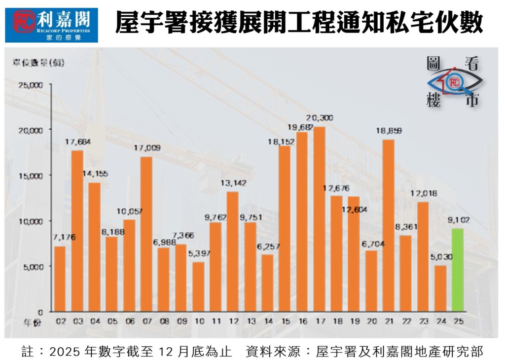 2025年私宅動工數字亮眼,徹底擺脫前年的低谷。根據屋宇署最新公布,全年私宅動工合共9,102伙,比2024年的5,030伙暴增近81%,已回復較合理的市場規模。去年12月單月僅錄得3伙動工(渣甸山、九龍塘及西貢白沙灣等傳統豪宅區的獨立屋項目),屬全年次低,但屋宇署補錄土瓜灣及小欖等項目數據後,全年總量進一步推高,顯示發展商加快推盤及開工的決心已明顯增強。