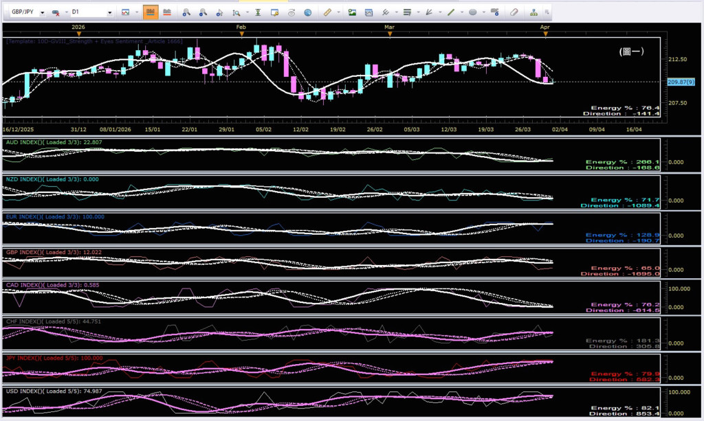 1. JPY日圓:[強弱指數@100/100;趨勢/力度@向上/+582;剩餘能量@20.1%]強弱指數在高極端水平,方向往上,力度普通,剩餘能量值不多,仍有少許餘力向上,但會反覆。