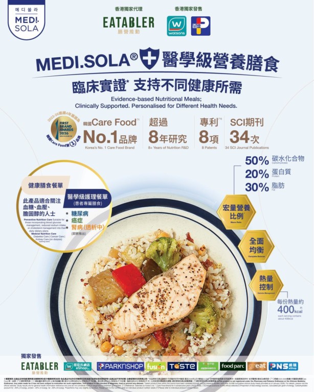 膳營推動集團有限公司將MEDI.SOLA®引繼香港領導營養膳食市場,其品牌連續四年於韓國榮獲第一品牌殊榮,產品即日起於 Eatabler 官網、屈臣氏網店、指定百佳超級市場門市及 PNS 網購獨家發售。隨著全球營養學講求精準,韓國於 2025 年率先推出「個人化健康功能食品系統」,透過提早精準營養介入管理健康,此情況亦帶動特殊醫療用途食品(Food for SpecialMedical Purpose)市場快速擴張。現代消費者對營養產品需求殷切,無論是飲食管理人士、或對營養有特殊需求的患者,都尋求注重科研及數據的選擇。