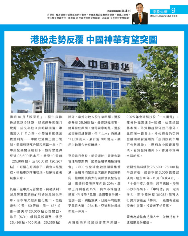 港股先機 :港股走勢反覆 中國神華有望突圍